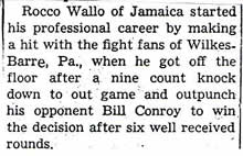 Rocco Wallo Born: Edvin Wallo (legally changed to Ed Wallo) February 16, 1924 Kingston, PA (near Wilkes-Barre) Fighting career spanned a decade: 1938-1941 While attending Dallas High School (PA) he started with regional amateur fights; generally 160-pound class. CYO boxing, and such. 1941-1943 Rocco wins 180-lb class while in the U.S. Marines, El Toro Base, CA 1943-1948 Pro fights in the New York area Light-Heavyweight Mgr: Jack Toner, St. Albans, NY Key Accomplishments As an amateur in the 160-pound class scored five consecutive victories to win the British Gloves Champion 1941 trophy. For "his outstanding fistic performance" he won the Rudolph Gunther Memorial Trophy at the Manhattan Downtown Atheletic Club by kayoing Ton Calbo Rocco won the 180-pound Championship of the West Coast U.S.M.C. Air Stations in 1943. As a pro fighting light-heavyweight saw action in approximately 30 fights including appearances in Madison Square Garden. Rocco was quoted explaining the absence of cauliflower ears with "...being too good - I didn't get hit."